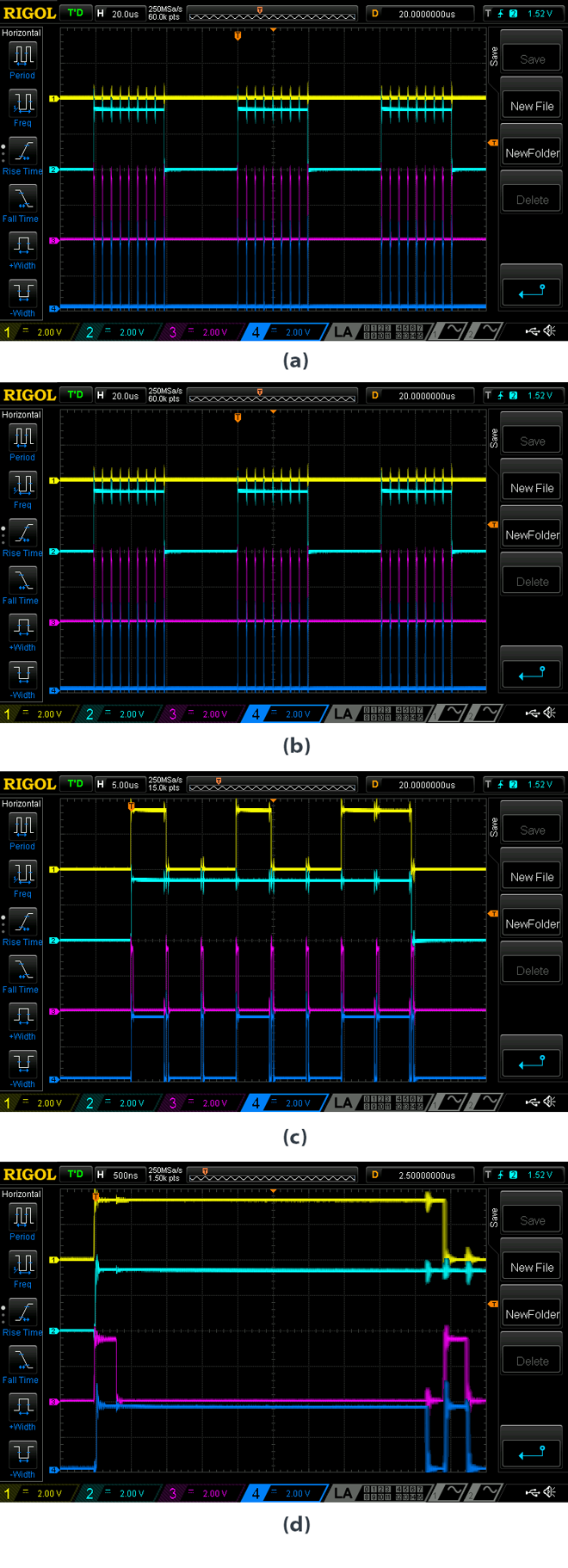 7.這些是“ Transmitter_170”傳輸?shù)氖纠?/span>通道1(黃色)是Serial_OUT,通道2(淺藍(lán)色)是中斷,通道3(品紅色)是時(shí)鐘,通道4(藍(lán)色)是DATA_OUTPUT。這些圖像顯示當(dāng)輸入信號(hào)為00000000a),輸入信號(hào)為10010011b),輸入信號(hào)為10010011c)時(shí)以及信號(hào)值較高的單個(gè)周期的縮放視圖(d)。