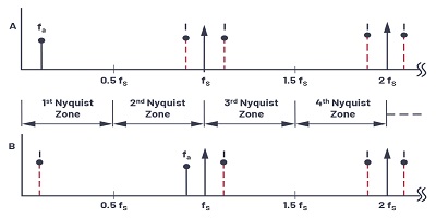 現(xiàn)在考慮信號在圖3中第一個Nyquist區(qū)域之外的情況。信號頻率僅略小于采樣頻率,這與圖2時域表示中所示的條件相對應(yīng)。請注意,即使信號在第一個奈奎斯特區(qū)域之外,其圖像(或別名)fS – fa落在內(nèi)部。返回圖3,很明顯,如果一個不想要的信號出現(xiàn)在fa的任何鏡像頻率上,它也會出現(xiàn)在fa上,從而在第一奈奎斯特區(qū)中產(chǎn)生一個雜散頻率分量。