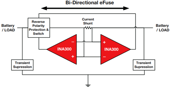雙向電流檢測(cè)電路使用一個(gè)簡(jiǎn)單的分流電阻,但放大器需要具有檢測(cè)各種共模電壓的能力。雙向電流感測(cè)技術(shù)比低壓側(cè)和高壓側(cè)感測(cè)有些復(fù)雜。有多種方法可以檢測(cè)雙向電流。在某些情況下,例如上圖,其中兩個(gè)電流檢測(cè)放大器INA300的連接方式將通過任何電流檢測(cè)放大器以兩種方式檢測(cè)電流。該電路需要反極性保護(hù)以及一種開關(guān)技術(shù),該技術(shù)將根據(jù)電路的極性來切換放大器的輸出。