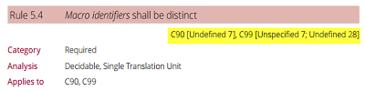 最著名的編程標(biāo)準(zhǔn)可能是MISRA標(biāo)準(zhǔn),該標(biāo)準(zhǔn)于1998年首次發(fā)布給汽車行業(yè)。這些標(biāo)準(zhǔn)的普及反映在提供某種級(jí)別的MISRA檢查的嵌入式編譯器中。MISRA的最新版本是MISRA C2012,其頁數(shù)幾乎是其前身的兩倍。這些附加文檔中的大多數(shù)包含有關(guān)每個(gè)規(guī)則為何存在的有用解釋,以及該規(guī)則的各種例外的詳細(xì)信息。MISRA有幾個(gè)準(zhǔn)則,并且在適用時(shí),它們包含對(duì)標(biāo)準(zhǔn)或未定義,未指定和實(shí)現(xiàn)定義的行為的引用。這樣的一個(gè)例子可以在圖3中看到。